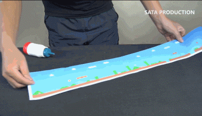 这里的马力欧形象来自于任天堂N64版的《纸片马力欧》,地图则是按照大家非常熟悉的红白机版《超级马力欧兄弟》第一关的样子,直接打印在纸上的。