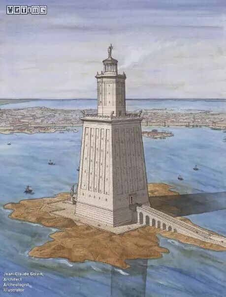 亚历山大灯塔是闻名世界的“七大奇观”之一。关于它的高度——由于年代久远一直没有明确的数字——大概在110~140米之间。根据资料记载,由于1303年和1323年两次地震的冲击,亚历山大灯塔赫然倒下。但在1480年,埃及国王利用法罗斯岛上灯塔剩余的石料建造了盖特贝城堡。《刺客信条 起源》中的亚历山大灯塔,很有可能综合地参考了亚历山大灯塔的假想图、和现在在灯塔位置的盖特贝城堡,最终出现在我们面前的就是游戏中那个四周由城墙围起、中间耸立着高塔的雄伟建筑。