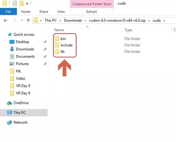 下载CUDNN v6.0完成后,解压相应的文件,复制bin、include和lib文件夹到CUDA 8.0工具集文件夹。