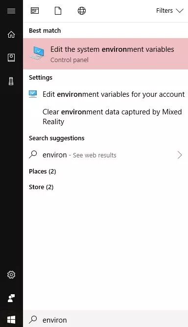 现在需要给系统添加环境变量和路径。按下Win键,在搜索框输入envir,这样搜索结果就自动出现了环境变量窗口,并选择点击进入。