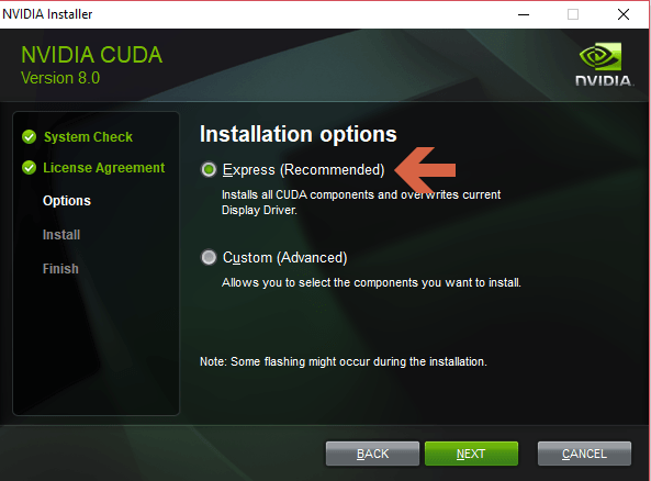 下载完成后运行安装程序,出现图02所示的选择安装界面。请选择“Express”。按照提示完成CUDA工具包的安装。
