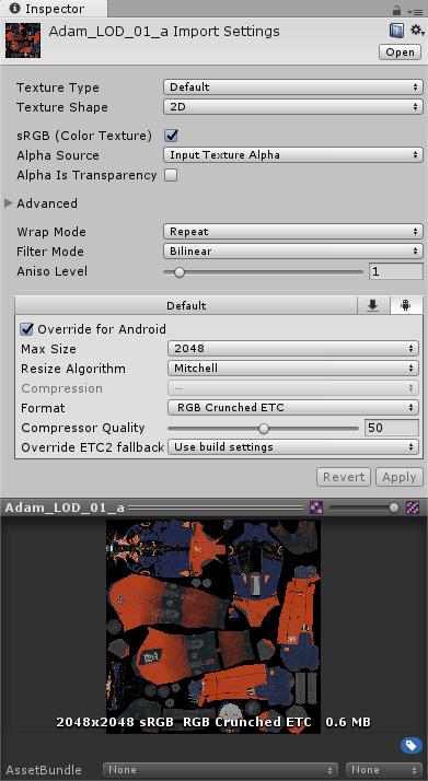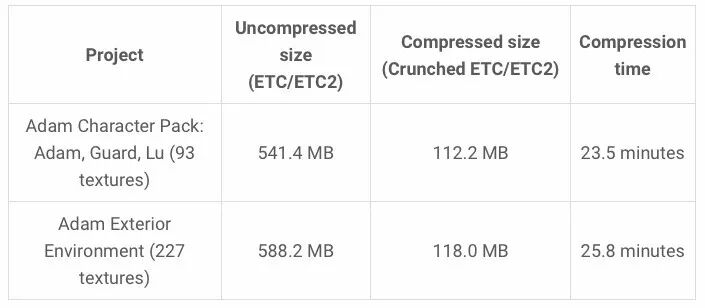我们用两个Asset Store资源商店中的Unity项目《Adam Character Pack: Adam, Guard, Lu》和《Adam Exterior Environment》进行了压缩性能测试。测试在Windows编辑器中运行,CPU采用i7-4790, 3.6GHz,使用默认Crunch质量设置。