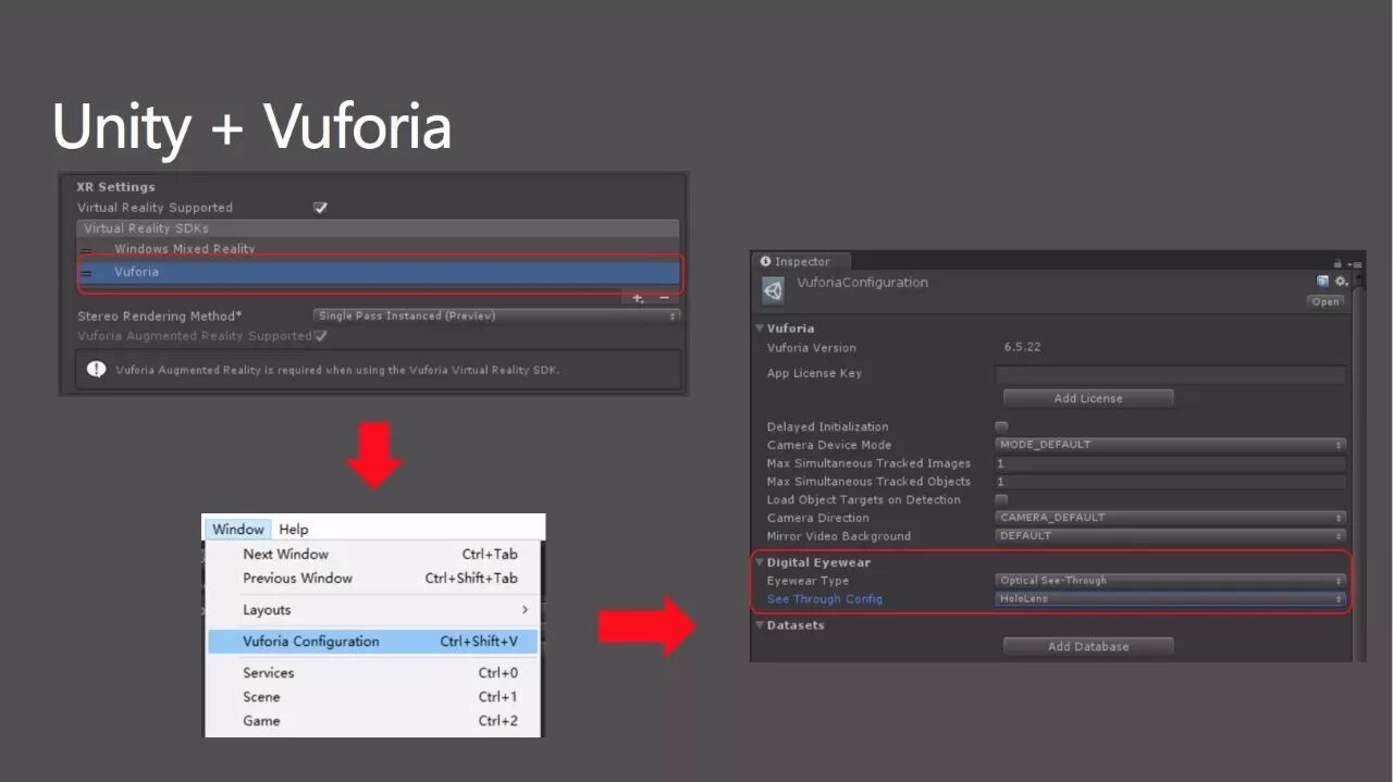 将HoloLens与Vuforia结合起来在Unity 2017.2中也很简单。只需要在Player Settings → XR Settings的Virtual Reality SDKs列表中再添加Vuforia,就可以获得该工具的AR支持。对于Vuforia关于HoloLens设置也不复杂。开发者可以通过Windows → Vuforia Configuration生成新的设置文件,为HoloLens专门修改Eyewear Type为Optical See-Through,以及调整See Through Config为HoloLens即可。当然,不要忘了设置App License Key。