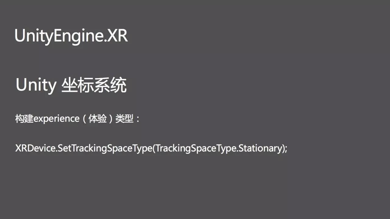 以构建体验类型的API为例,如果要在Windows Mixed Reality平台开发Seated-scale(坐定式)体验,就必须调用XRDevice.SetTrackingSpaceType,设置TrackingSpaceType为TrackingSpaceType.Stationary,即静态的固定跟踪空间的类型。这个操作实际上设置了Unity的世界坐标系来跟踪固定的参考系。在固定跟踪模式下,放置在编辑器,位于相机默认位置前方(Transform为-Z)的内容将在应用启动时,会显示在用户面前。