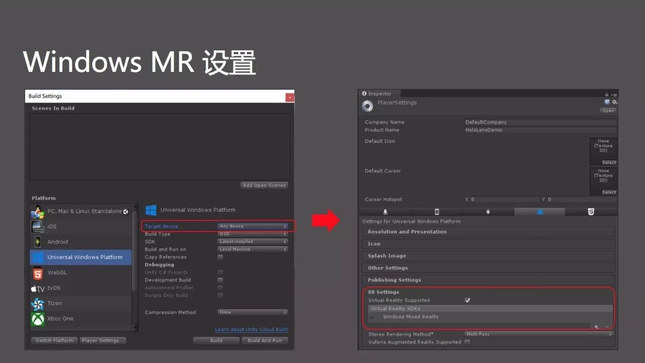 在Unity 2017.2设置Windows Mixed Reality平台也很容易: