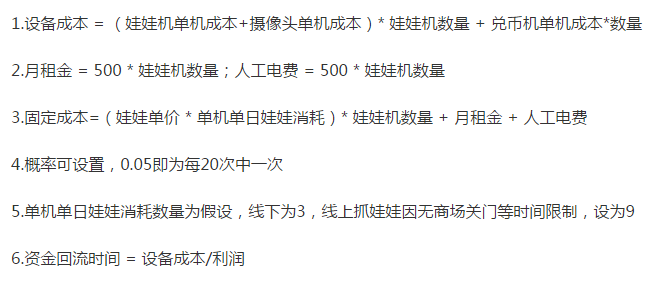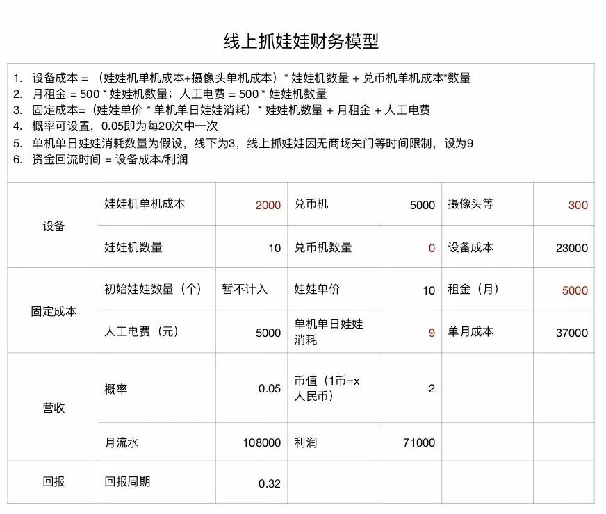 通过知乎上分享的一则财务模型(如图)我们不难看出,线上抓娃娃固定成本支出的大头与线下无异,仍然在设备与运维上,在抓取率不变的前提下,显然是机器台数少的回本更快。