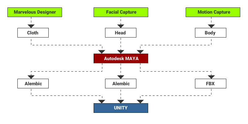 数据随后被导入到Autodesk Maya,进行进一步清理和调整后导出为一个Alembic文件。这是流程的示意图。