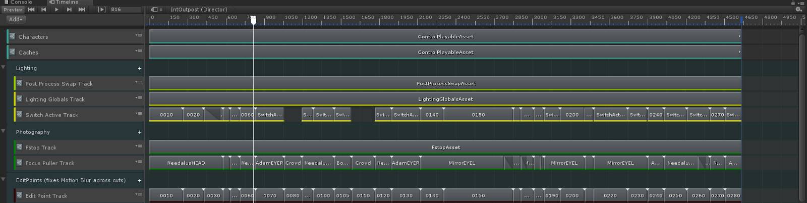有了Timeline中的所有东西,Oats可以同步并根据每个镜头的时间对所有资源进行排序,以进行实时回放。但是在实际的生产过程中,大量的资源会很容易使Timeline编辑器界面杂乱不堪,极难维护。为了解决这个问题,Oats使用可自由展开和折叠的TrackGroup来组织场景中的资源。为了进行更好的组织管理,Oats还使用了另一个Unity特性ControlTrack,它可用于处理多个嵌套的Timeline实例。