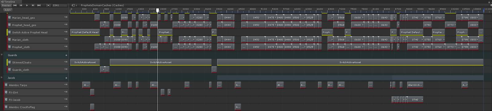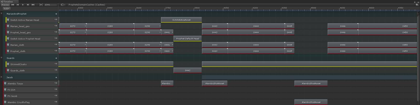 在Unity中的这个阶段,Oats将Timeline作为一个装配工具,组合Alembic资源,并在场景空间中将它们和其它资产一起进行编排。例如为了完整地组装一套角色表演,使用了两个Alembic轨道,分别用于面部和布料。这两个轨道位于一个包含FBX格式的身体表演的Animation轨道之上,如下图所示。