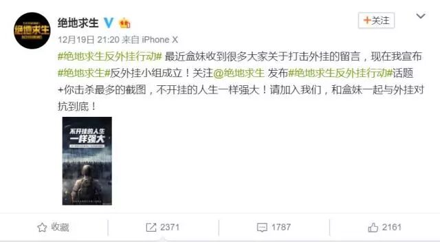 显然,“反外挂”成为腾讯正版国服击出的第一记重拳。国服消息确认后,官方微博率先发布反外挂宣言,表明将对外挂进行严厉打击。PUBG也公布与腾讯共同开发反外挂系统,基于腾讯多年以来反外挂的领先技术,双方共同开发的系统将在技术层面上切实解决外挂问题。