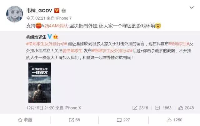 随着近日官方正式成立“反外挂小组”,令反外挂有正式落地的官方组织,并迅速在意见领袖和核心玩家中掀起风暴,纷纷通过不同渠道晒出“吃鸡”截图响应。众多知名主播的参与,令“反外挂”成为社交热点。