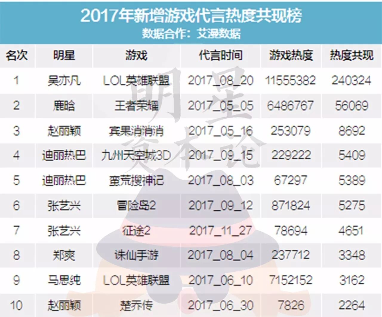 事实上,嘉行艺人中杨幂和迪丽热巴今年都接了游戏代言,在热度共现上,前10占了3席。或许是基于对游戏代言的严格把控,迪丽热巴虽然在3月份接了一个页游《乾坤战纪》,但好像并没有像上述页游一样引起反感。