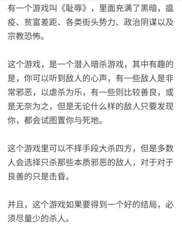 他认为《耻辱》是款好游戏,你可以选择杀死敌人,也可以选择不伤害他或者只是击晕他。如果想获得一个好的结局,必须尽量少杀人的设定,就像现实中的“因果报应”一样,本质是教人向善的。