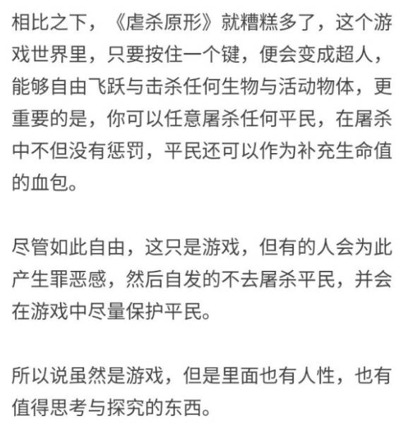 而《虐杀原形》在残杀平民的时候反而会得到回血的奖励,鼓励主角去作恶,就让这款游戏相当恶劣了。但说到底游戏只是游戏,关键在于玩游戏的人。“有的人会产生罪恶感,去保护游戏中的平民。”