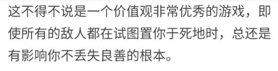 “这不得不说是一个价值观非常优秀的游戏,即使所有的敌人都在试图置你于死地时,总还是有影响你不丢失良善的根本。”