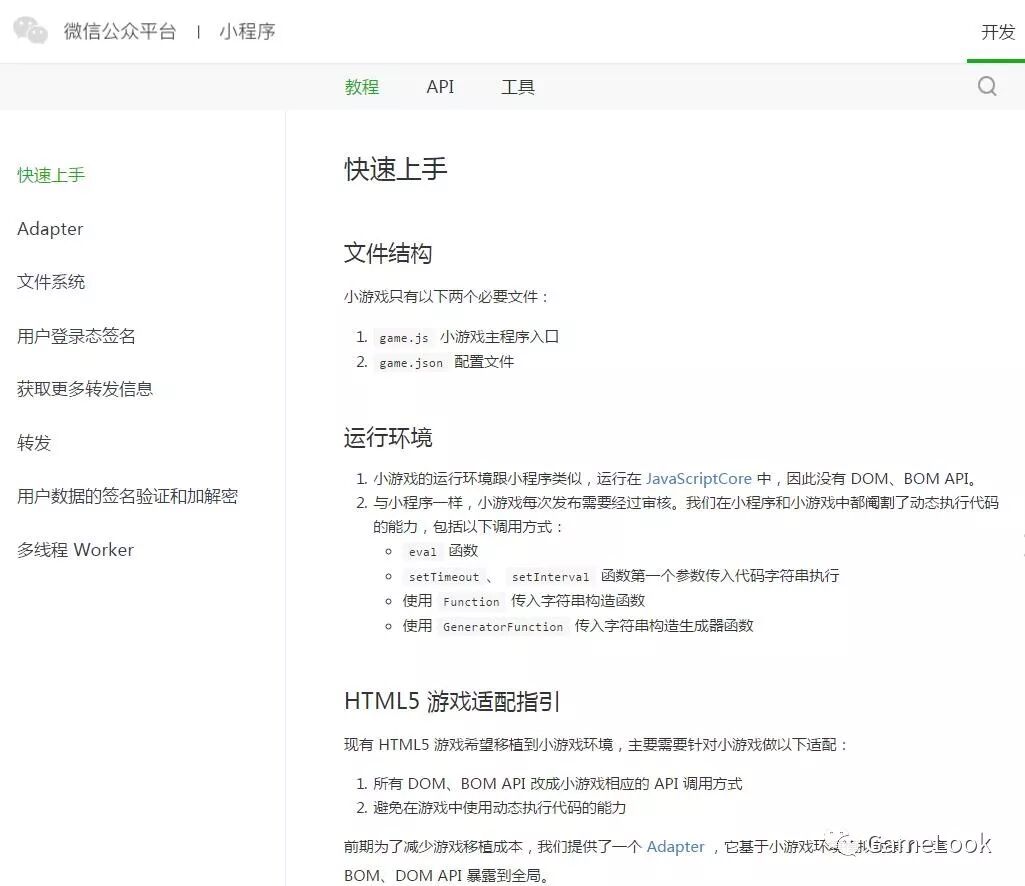 在开发者文档中,微信写到,小游戏只有两个必要文件:1.game.js 小游戏主程序入口 2.game.jason 配置文件,游戏运行在JavaScriptCore中。 微信明确支持HTML5游戏。