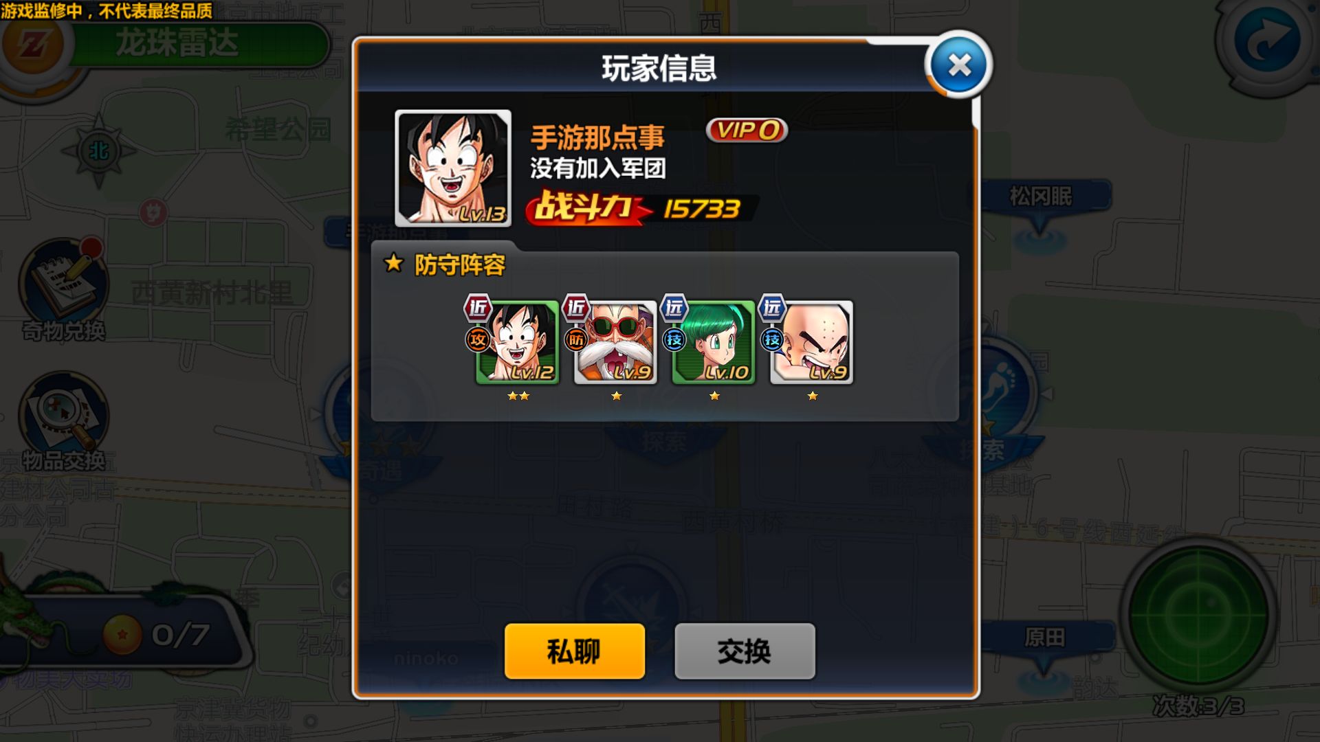 搜索到附近玩家后点击ID,界面会显示这位玩家的相关游戏信息,包括“等级”、“战斗力”、“阵容”等,除了玩家资料外,《龙珠觉醒》目前还提供了玩家间私聊和交换物品的功能。