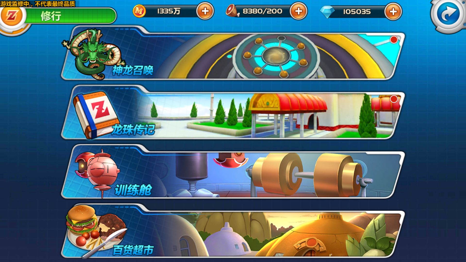 在试玩的过程中,笔者察觉到《龙珠觉醒》的制作组或许有一个大胆的想法。在游戏界面的修行按钮里面,有一个称为“神龙召唤”的玩法: