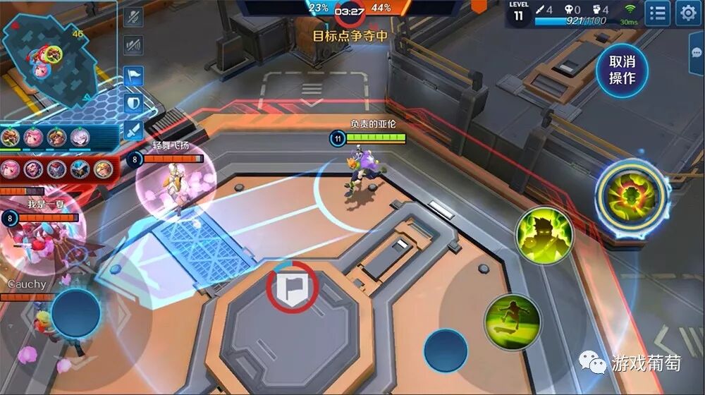 但之后你会发现,射击并非这款游戏的全部,因为每个英雄都有两个主动技能和一个需要充能的终极技能,拖拽技能键,你就可以向特定方向释放技能——这是MOBA游戏中常见的操作模式。