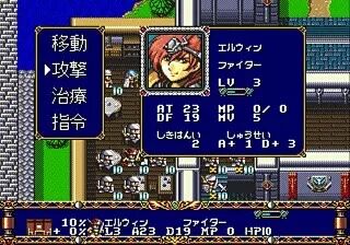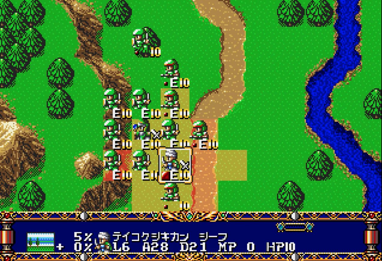 1994年《梦幻模拟战II》的出现,也基本宣告了初代在中国人气的终结。最直观的原因就在于他的画面表现,真是堪称完美的用色表现。能将MD的同屏64色,做出显著的明暗变化。更厉害的是,这款游戏角色的指挥范围框,竟然是半透明的!原谅我把字写得这么大,不过MD真的没有半透明的特效。盖因这款游戏用到了十分少见的MD硬件特效:高亮阴影。这种将一部分像素高亮或低亮着色的能力,理论上可以将MD的同屏色数扩大至三倍,一般用于模拟光与透明效果上。而《梦幻模拟战II》则是令指挥框不断用三种亮度交替闪烁,可以说是最物尽其用的一款作品。