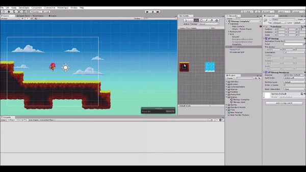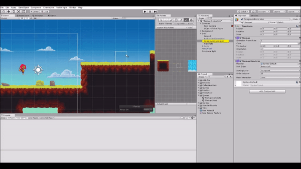 现在要向调色板加入新瓦片,拖动精灵到调色板中,会打开一个新窗口,询问瓦片的保存位置。你也可以通过精灵图集拖动多个瓦片。在调色板中有了瓦片后,要想把瓦片添加到Tilemap上,你必须选择一个瓦片再拖动它。瓦片加入调色板后,就可以用笔刷绘制场景了。