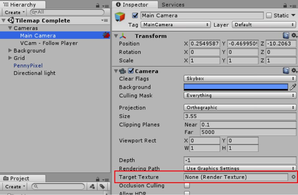 我们要在Asset文件夹里新建一个渲染纹理(Render Texture),添加到摄像机上。你可以在项目窗口依次点击Create -> Render Texture来新建渲染纹理。创建好后,你可以将它拖到摄像机上的Target Texture属性中。摄像机这时会将所有对象都渲染到这个纹理上。如果现在进入运行模式,游戏画面将呈现为一片漆黑,因为目前没有激活的摄像机渲染到屏幕上。