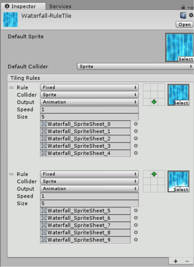 Custom Tiles Palette包含瀑布瓦片。如果选中瀑布规则瓦片,也就是Waterfall-RuleTile,可以看到它的导出类型为动画(Animate)。这样就可以为每个瓦片指定动画帧。
