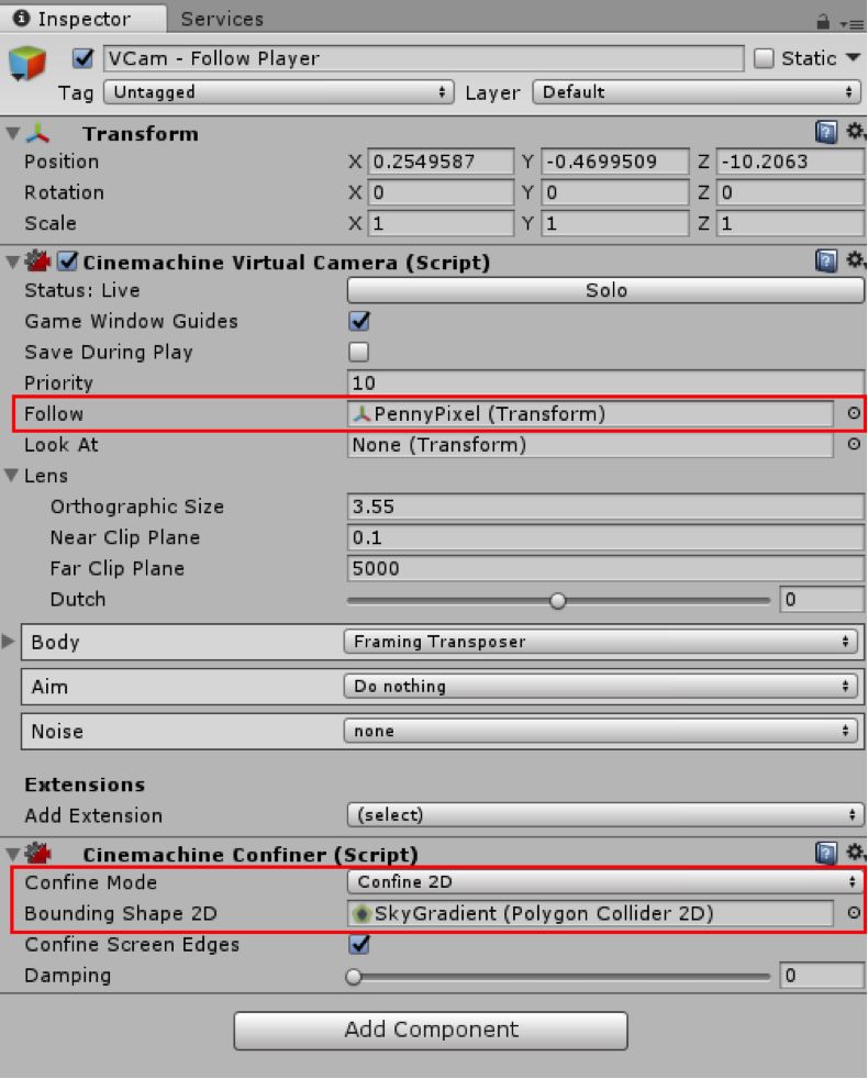 如果这是你首次添加该组件到场景中,它还会自动添加一个Cinemachine Brain到你的摄像机上,并创建一个带有Cinemachine Virtual Camera组件的GameObject对象。我们可以将我们的角色设为跟随对象,即下图中的Follow属性。在2D下设置虚拟摄像机的过程和3D中的一样。