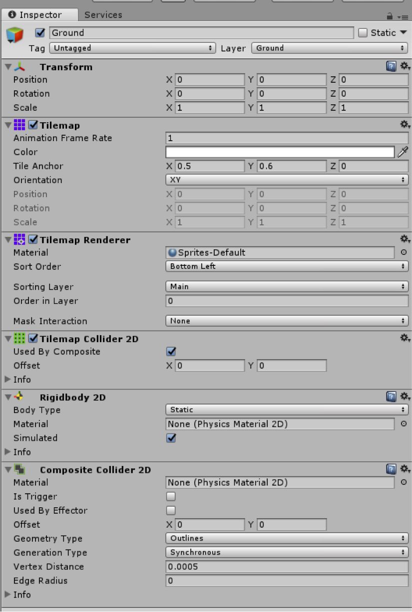 当绘制好场景后,角色还不能在场景的地面上移动,因为还没添加碰撞体。在Tilemap中添加碰撞体十分简单,只要给Tilemap对象加入一个Tilemap Collider 2D组件即可。可以看到,这个组件自动为该Tilemap上的所有瓦片都加入了碰撞体。