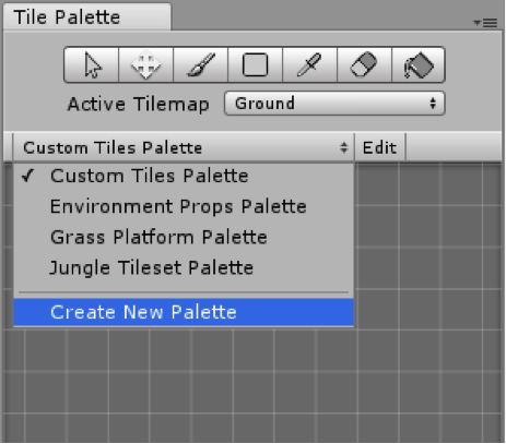 然后依次点击Window->Tile Palette打开调色板窗口。在调色板窗口中,选择Create New Palette,如图02所示。设置名字和属性,然后指定保存位置。