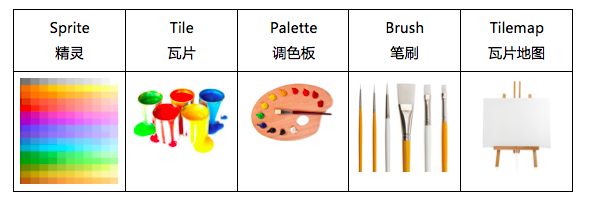 首先,介绍一下Tilemap的基本概念,Tilemap用起来其实就和现实中画画一样,它由以下五个基本部分组成: