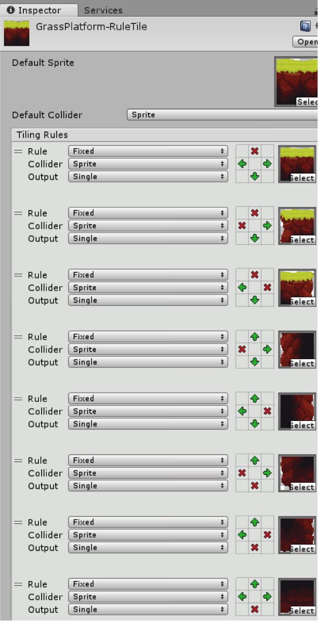 2d-extras中最重要的工具之一就是规则瓦片(Rule Tile)。不用这个工具的话,我们每次在Tilemap上绘制时,都要从调色板选取特定瓦片再进行绘制。如果你想要绘制相邻瓦片,例如一个拐角,你需要从调色板上一次次选取不同瓦片进行绘制。这种方法效率不高。但有了规则瓦片,你可以为相邻瓦片设置一组规则,它将自动选择最合适的瓦片进行绘制。