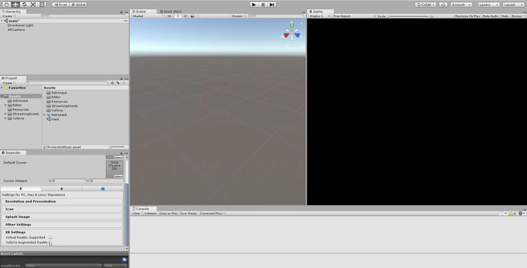 首先下载并安装Unity 2017.3.0p2版本,在安装过程中,在选择组件时确保勾选了“Vuforia Augmented Reality Support”选项。新建一个Unity项目,在PlayerSettings/XR中,勾选Vuforia Augmented Reality Support。使用AR摄像机来替换默认的主摄像机(GameObject Menu>Vuforia>AR Camera)。