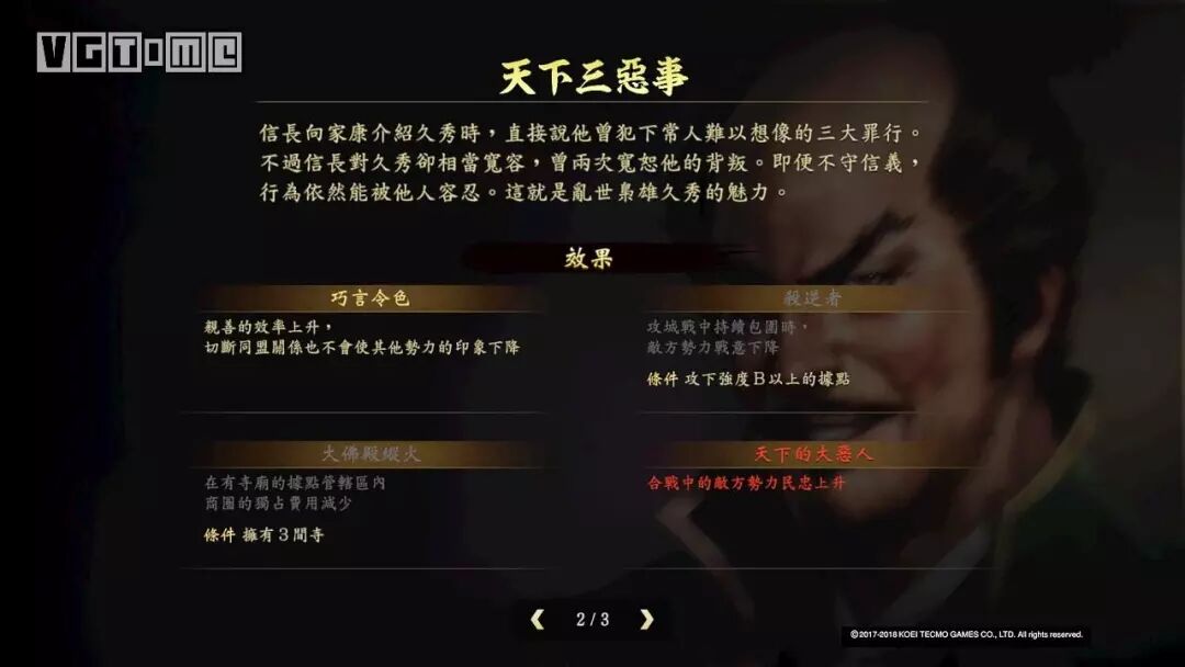 杀害主人、讨伐将军、烧毁大佛 —— 这便是游戏中松永久秀的特性之一“天下三恶事”,而且这三件恶事还是织田信长帮他总结的。在《常山纪谈》中,信长对其评价为“这个老人是个稀世罕见的恶人。篡夺主家、暗杀将军、焚烧佛殿,这三恶事常人连一件都不敢做,他全都做了。”