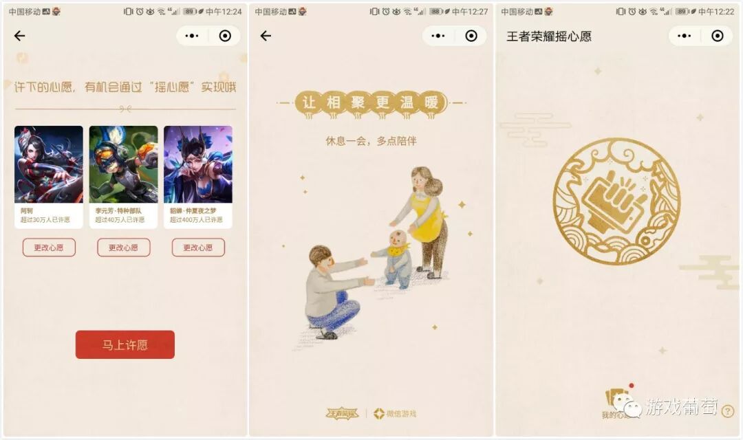 与大的版本更新同步进行的,往往是产品内的运用活动。而《王者荣耀》在产品内的运营上也已经有过不少次的成功案例,比如长城守卫军系列和周年庆活动。而在春节这种辞旧迎新的时刻,《王者荣耀》推出的运营活动思路集中在回馈用户上,比如特别的新年许愿活动,根据QQ和微信的不同特性,QQ区和微信区的许愿活动参与方式还略有不同。