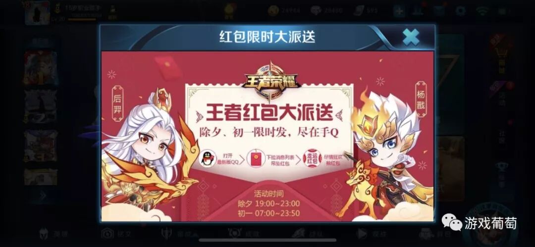 更为明显的回馈用户的活动,是除夕、初一限时开启的“王者红包大派送”,用户在手机QQ客户端下拉直接可以参与抽红包活动。发红包这种形式既符合过年的氛围,又能调动大量用户的参与度,且用户能更加直接地感受到回馈。