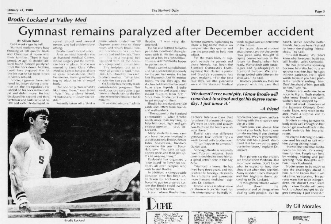 身为斯坦福大学的学生兼体操运动员,时年19岁的Brodie在一次训练中不慎撞击到了颈部,倒在缓冲用的泡沫坑中无法动弹。事后,斯坦福大学校报《The Stanford Daily》在一篇后续报道中刊载了Brodie受伤的具体情况: