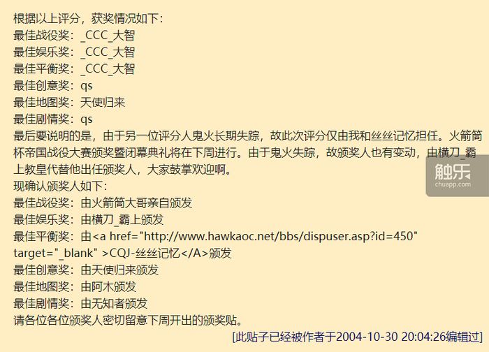 qs告诉我,当时论坛的规模不大,大家对水帖这件事也没什么反感,因此火箭筒这个用户也逐渐成了论坛的吉祥物兼“精神领袖”。很多成员都知道水王只是一名初中生,可能是论坛最年轻的用户,但他们喜欢故意把他称呼为“火箭筒爷爷”。当有人提议进行限时地图制作大赛时,这个声名远扬的吉祥物的ID也就被直接用作大赛名称了。