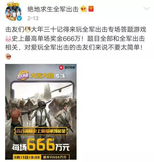 2月13日,《绝地求生 全军出击》(简称《全军出击》)更新了新春版本。上线“速战速决”模式,10分钟即可体验“吃鸡”,这一模式主打碎片化时间竞技,缩短每局的游戏时间,降低游戏门槛。在新春版本中,《全军出击》还推出登录领取时装、抢空投红包等福利活动。除此之外,官方宣布彭于晏成为游戏代言人,吸引了一波关注。在大年三十,《全军出击》还与在线答题游戏《百万英雄》合作,设立全军出击专场,单场奖金高达666万。