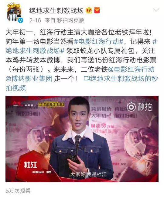 作为《全军出击》同日上线的兄弟款《绝地求生 刺激战场》(简称《刺激战场》),除了与前者类似的游戏内活动运营之外,《刺激战场》与春节档电影《红海行动》合作。选择这部军事题材电影,两者结合在一起并不显得突兀。截至目前,《红海行动》票房达到了11亿,票房和口碑双双逆袭。此外,包括微博、QQ音乐等APP也时常出现腾讯这两款“吃鸡”手游的开屏广告。