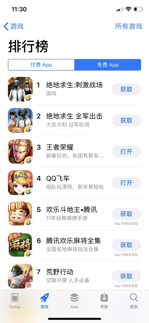 在这股风潮之下,腾讯旗下两款棋牌游戏《欢乐斗地主》、《欢乐麻将全集》借着春节的东风,App Store游戏免费榜上的排名大幅上涨,分别位列第五、第六名,甚至一度超过网易“吃鸡”手游《荒野行动》。可见,在春节这一特殊的时间点,上手门槛低、适合多人娱乐的棋牌游戏需求量不可小觑。