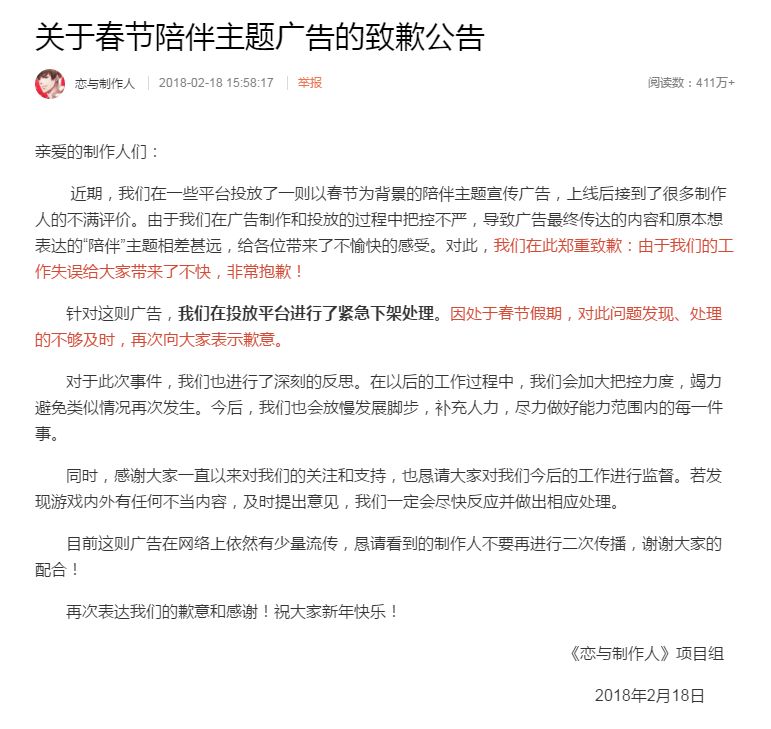 网友认为广告中塑造的角色完全丑化了玩家,将玩家之间的梗带入到现实中,自嘲和他嘲有着天壤之别。于是这种情绪在网络上立刻被引爆。随后,官方删除了原视频并发微博道歉,但玩家的怒气并未被平息,在本应开心的春节假期平白无故被添堵,叠纸游戏的这次广告营销可以称得上是反面营销案例了。