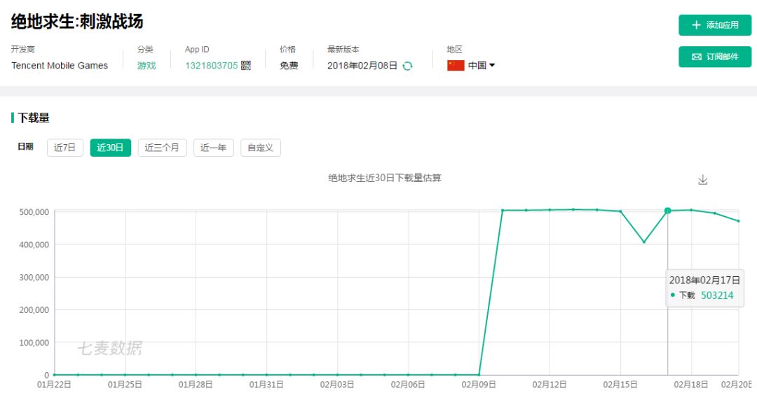 截至目前,腾讯的两款“吃鸡”手游《刺激战场》、《全军出击》在iOS游戏免费榜中占据前两名,《荒野行动》排在榜单TOP5。根据ASO100预估的数据,《刺激战场》在iOS平台的每日下载量在50万左右,《全军出击》的这一数据达到39万。相比之下,《荒野行动》的每日下载量较低,仅在12万左右。