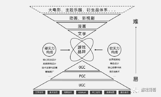 当硬实力和软实力都有一定基础之后,才会有用户围绕其有丰富的UGC、PGC内容产出,同时官方通过OGC内容的产出,引导玩家进行持续的社区活跃,暴雪就是一个典型,除了玩法相关内容之外,大量的音乐、漫画、CG很好的推动了社区活跃。当一个产品同时具备了的金字塔加上两边的内容以后,就可以说是已经形成了自己的品牌影响力。