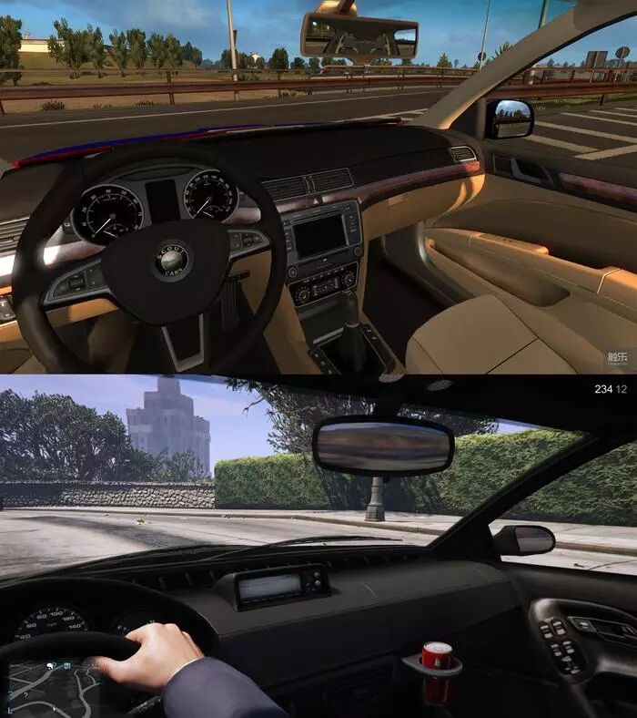 从欣赏豪车的角度,“欧卡”(上)显然比《GTA5》(下)更符合快手人民的胃口