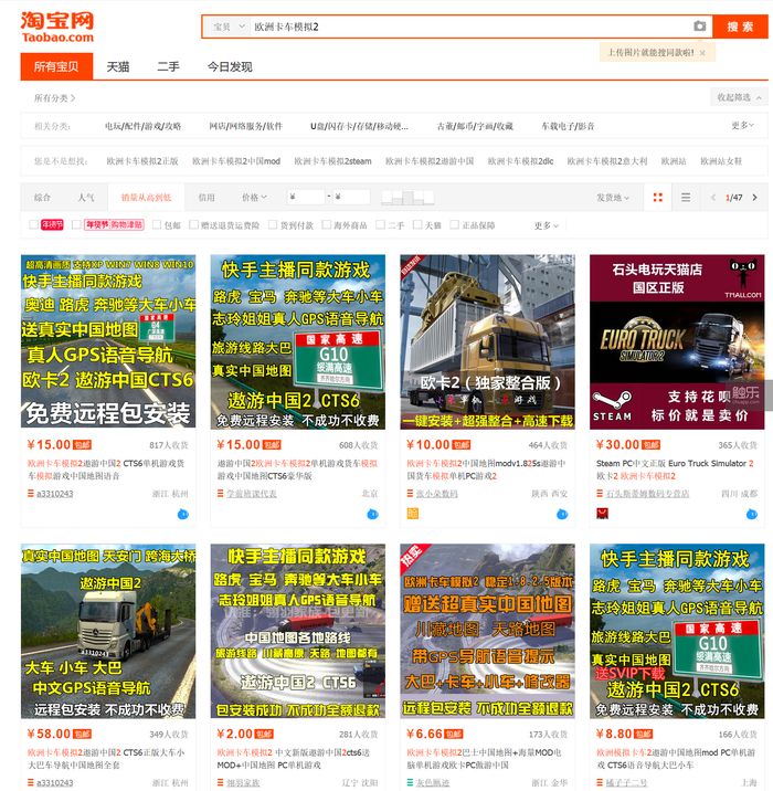打开淘宝,搜索“欧洲卡车模拟”,你会发现另一种不一样的“欧卡”。在返回的搜索结果中,大概有一半是在销售一款名为《遨游中国2》或者《中国卡车模拟6》的游戏(这个系列简称“中卡”、CTS),剩下的另一半才是卖“欧卡”的Steam激活码——而且前者的销售量远高于后者。