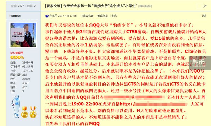 第二天,我在“中国卡车模拟”贴吧里看到了驹痴少爷发的帖子,其中包含我们昨晚对话的部分截图。驹痴少爷留言说:“H狗终于不行了,我被采访才得以洗冤。”
