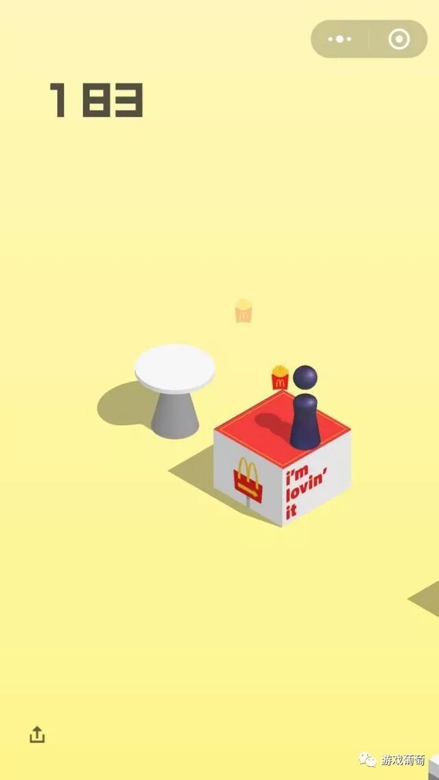 首先是在春节期间,《跳一跳》推出了印有麦当劳品牌logo的平台,当小人跳跃至麦当劳平台后,平台上的图案会由logo变为麦当劳经典slogan“i'm lovin' it”,停留一段时间后会冒出汉堡图标并获得20分加分。这次合作是小游戏与商业品牌的第一次“接触”。