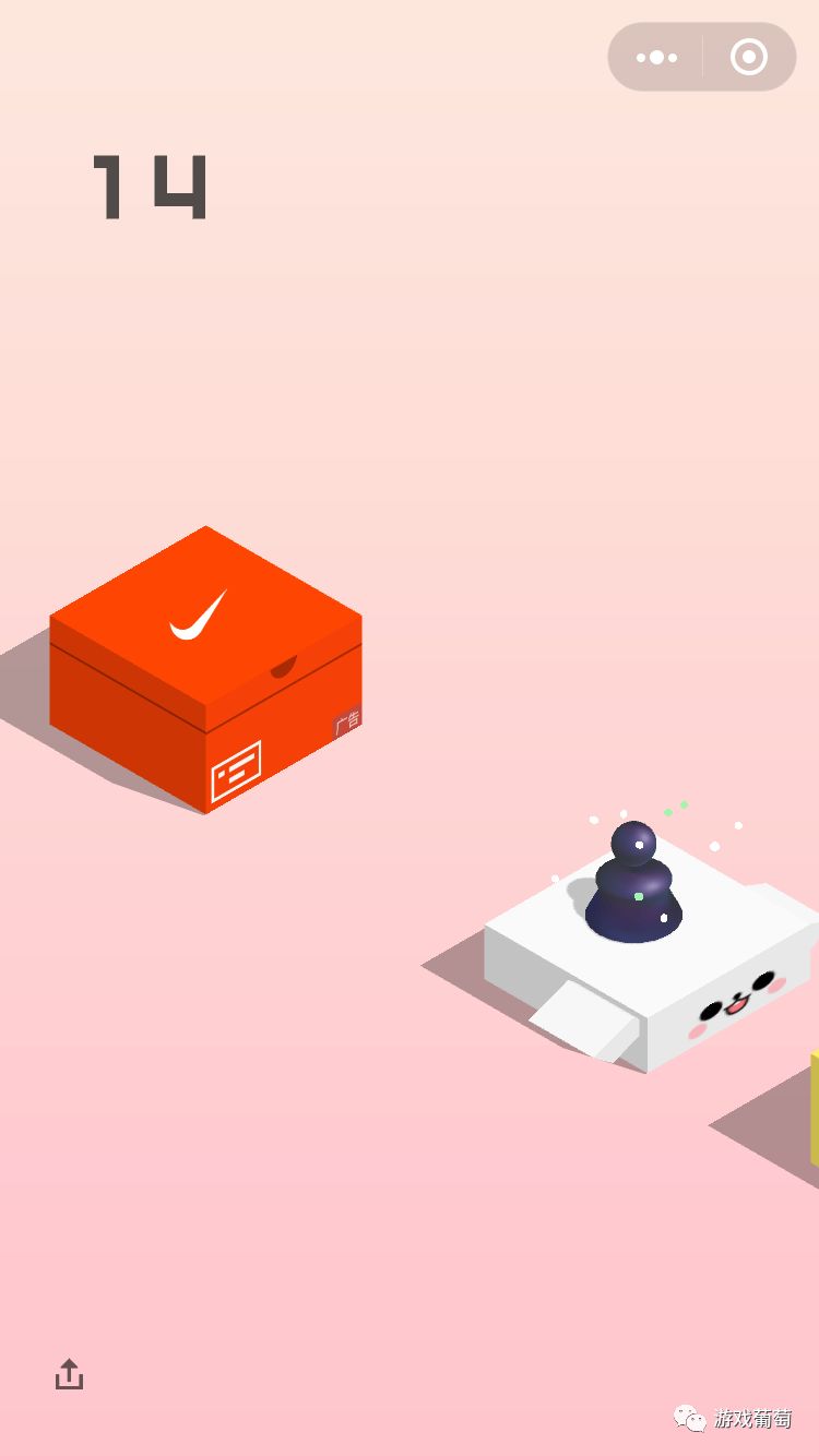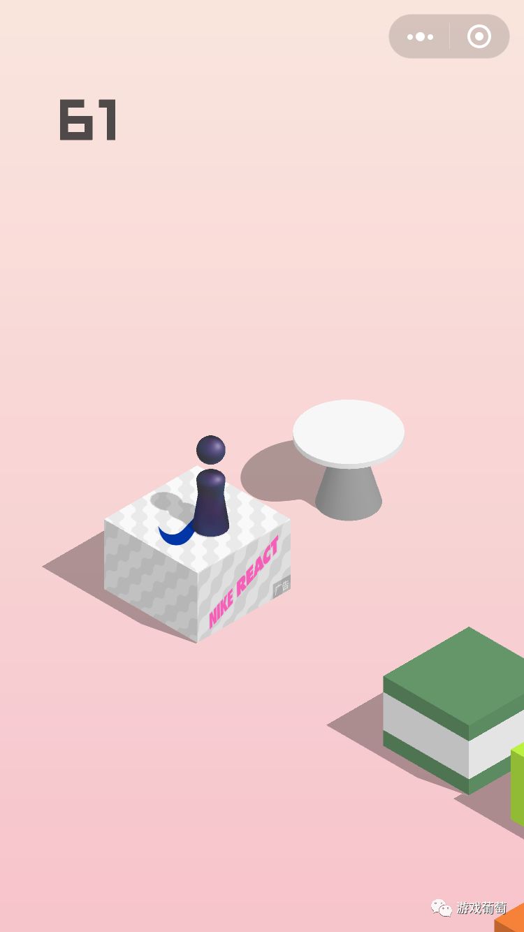 在今天,《跳一跳》中又增添了耐克平台,这次的平台上除了印有耐克品牌logo之外,还添加了“广告”二字,明确了耐克与微信小游戏之间的商业合作关系。