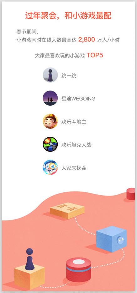 近日,腾讯官方公布了一组数据。数据显示,春节期间,微信小游戏同时在线人数最高达2800万人/小时。其中,《跳一跳》荣登“最受欢迎小游戏”排行榜首位,与《星途WeGoing》、《欢乐斗地主》、《欢乐坦克大战》、《大家来找茬》共同组成春节期间“大家最爱玩的小游戏Top5”。